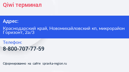 Qiwi, терминал по адресу Краснодарский край, Новомихайловский кп, микрорайон Горизонт, 2а/3 в дальнейшем Организация, размещена в следующих категориях: