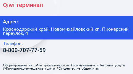Qiwi, терминал по адресу Краснодарский край, Новомихайловский кп, Пионерский переулок, 4 в дальнейшем Организация, размещена в следующих категориях: