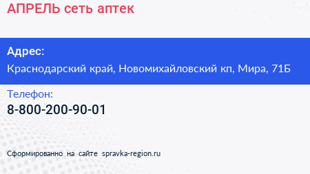 АПРЕЛЬ, сеть аптек по адресу Краснодарский край, Новомихайловский кп, Мира, 71Б в дальнейшем Организация, размещена в следующих категориях: