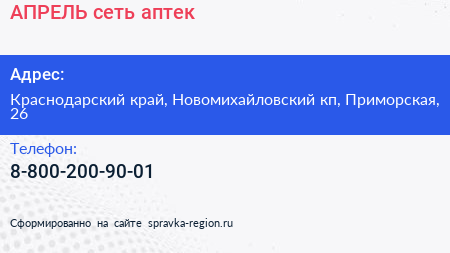 АПРЕЛЬ, сеть аптек по адресу Краснодарский край, Новомихайловский кп, Приморская, 26 в дальнейшем Организация, размещена в следующих категориях: