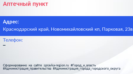 Аптечный пункт по адресу Краснодарский край, Новомихайловский кп, Парковая, 23в в дальнейшем Организация, размещена в следующих категориях: