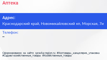 Аптека по адресу Краснодарский край, Новомихайловский кп, Морская, 7и в дальнейшем Организация, размещена в следующих категориях: