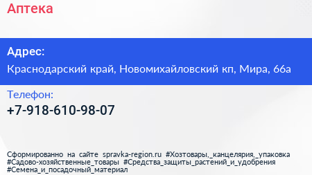 Аптека по адресу Краснодарский край, Новомихайловский кп, Мира, 66а в дальнейшем Организация, размещена в следующих категориях: