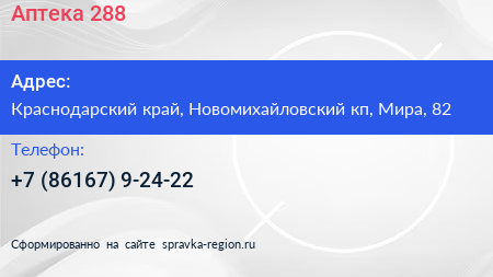 Аптека №288 по адресу Краснодарский край, Новомихайловский кп, Мира, 82 в дальнейшем Организация, размещена в следующих категориях: