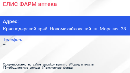 ЕЛИС-ФАРМ, аптека по адресу Краснодарский край, Новомихайловский кп, Морская, 38 в дальнейшем Организация, размещена в следующих категориях: