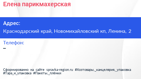 Елена, парикмахерская по адресу Краснодарский край, Новомихайловский кп, Ленина, 2 в дальнейшем Организация, размещена в следующих категориях: