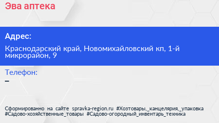 Эва, аптека по адресу Краснодарский край, Новомихайловский кп, 1-й микрорайон, 9 в дальнейшем Организация, размещена в следующих категориях: