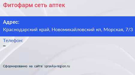 Фитофарм, сеть аптек по адресу Краснодарский край, Новомихайловский кп, Морская, 7/3 в дальнейшем Организация, размещена в следующих категориях: