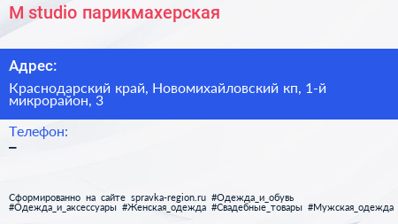 М-studio, парикмахерская по адресу Краснодарский край, Новомихайловский кп, 1-й микрорайон, 3 в дальнейшем Организация, размещена в следующих категориях: