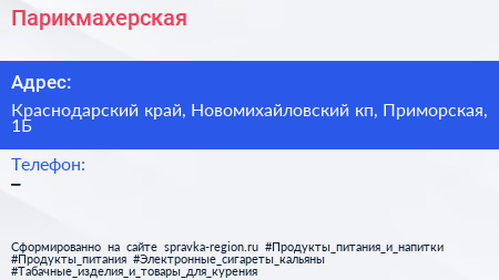 Парикмахерская по адресу Краснодарский край, Новомихайловский кп, Приморская, 1Б в дальнейшем Организация, размещена в следующих категориях: