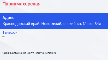 Парикмахерская по адресу Краснодарский край, Новомихайловский кп, Мира, 84д в дальнейшем Организация, размещена в следующих категориях:
