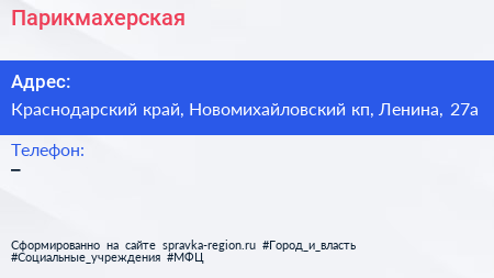 Парикмахерская по адресу Краснодарский край, Новомихайловский кп, Ленина, 27а в дальнейшем Организация, размещена в следующих категориях: