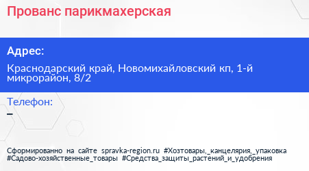 Прованс, парикмахерская по адресу Краснодарский край, Новомихайловский кп, 1-й микрорайон, 8/2 в дальнейшем Организация, размещена в следующих категориях: