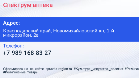 Спектрум, аптека по адресу Краснодарский край, Новомихайловский кп, 1-й микрорайон, 2в в дальнейшем Организация, размещена в следующих категориях: