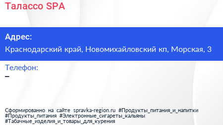 Талассо-SPA по адресу Краснодарский край, Новомихайловский кп, Морская, 3 в дальнейшем Организация, размещена в следующих категориях: