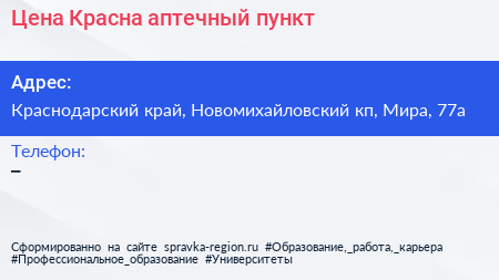 Цена Красна, аптечный пункт по адресу Краснодарский край, Новомихайловский кп, Мира, 77а в дальнейшем Организация, размещена в следующих категориях: