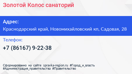 Золотой Колос, санаторий по адресу Краснодарский край, Новомихайловский кп, Садовая, 28 в дальнейшем Организация, размещена в следующих категориях: