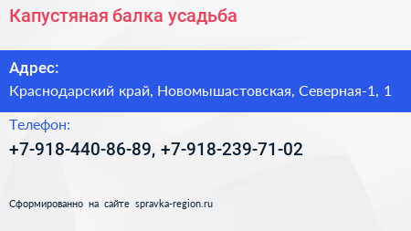 Капустяная балка, усадьба по адресу Краснодарский край, Новомышастовская, Северная-1, 1 в дальнейшем Организация, размещена в следующих категориях: