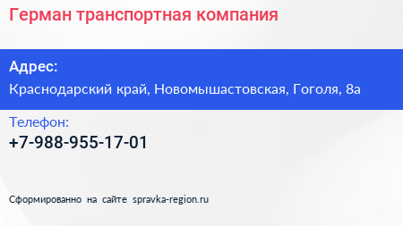 Герман, транспортная компания по адресу Краснодарский край, Новомышастовская, Гоголя, 8а в дальнейшем Организация, размещена в следующих категориях: