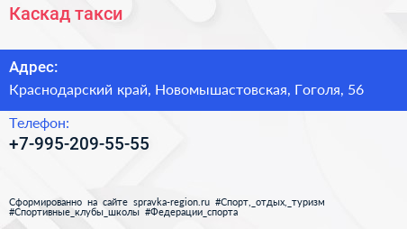 Каскад, такси по адресу Краснодарский край, Новомышастовская, Гоголя, 56 в дальнейшем Организация, размещена в следующих категориях:
