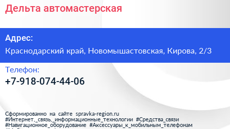 Дельта, автомастерская по адресу Краснодарский край, Новомышастовская, Кирова, 2/3 в дальнейшем Организация, размещена в следующих категориях: