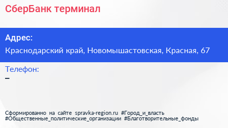 СберБанк, терминал по адресу Краснодарский край, Новомышастовская, Красная, 67 в дальнейшем Организация, размещена в следующих категориях: