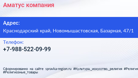 Аматус, компания по адресу Краснодарский край, Новомышастовская, Базарная, 47/1 в дальнейшем Организация, размещена в следующих категориях: