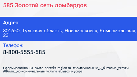585*Золотой, сеть ломбардов по адресу 301650, Тульская область, Новомосковск, Комсомольская, 23 в дальнейшем Организация, размещена в следующих категориях: