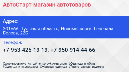 АвтоСтарт, магазин автотоваров по адресу 301666, Тульская область, Новомосковск, Генерала Белова, 22Б в дальнейшем Организация, размещена в следующих категориях:
