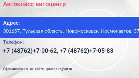 Автокласс, автоцентр по адресу 301657, Тульская область, Новомосковск, Космонавтов, 37 в дальнейшем Организация, размещена в следующих категориях:
