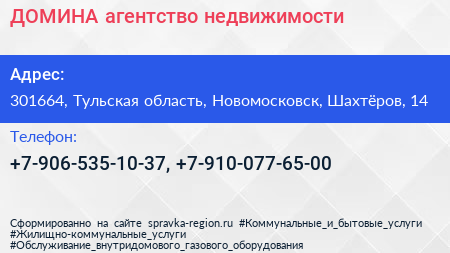 ДОМИНА, агентство недвижимости по адресу 301664, Тульская область, Новомосковск, Шахтёров, 14 в дальнейшем Организация, размещена в следующих категориях: