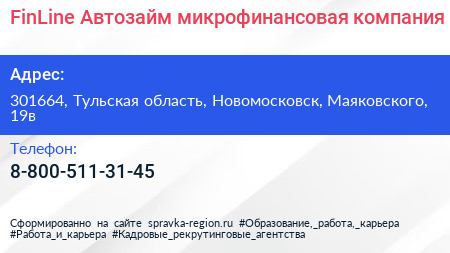 FinLine-Автозайм, микрофинансовая компания по адресу 301664, Тульская область, Новомосковск, Маяковского, 19в в дальнейшем Организация, размещена в следующих категориях: