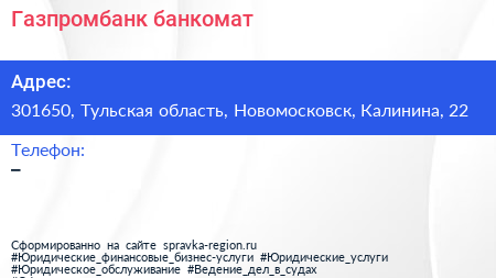 Газпромбанк, банкомат по адресу 301650, Тульская область, Новомосковск, Калинина, 22 в дальнейшем Организация, размещена в следующих категориях: