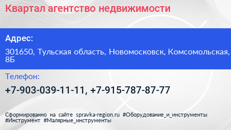Квартал, агентство недвижимости по адресу 301650, Тульская область, Новомосковск, Комсомольская, 8Б в дальнейшем Организация, размещена в следующих категориях: