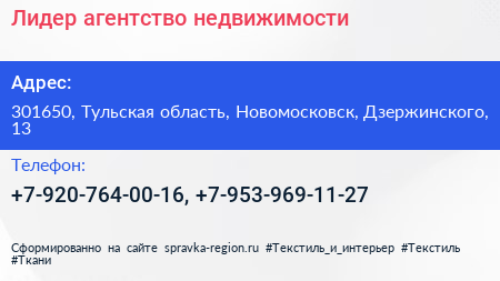 Лидер, агентство недвижимости по адресу 301650, Тульская область, Новомосковск, Дзержинского, 13 в дальнейшем Организация, размещена в следующих категориях: