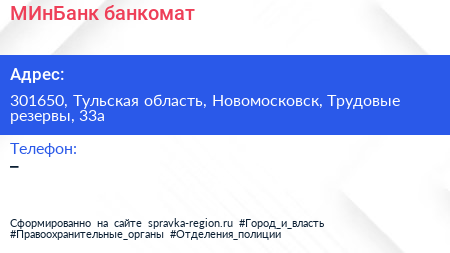 МИнБанк, банкомат по адресу 301650, Тульская область, Новомосковск, Трудовые резервы, 33а в дальнейшем Организация, размещена в следующих категориях:
