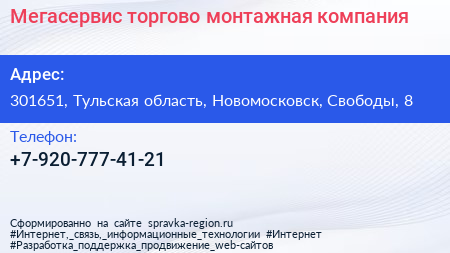 Мегасервис, торгово-монтажная компания по адресу 301651, Тульская область, Новомосковск, Свободы, 8 в дальнейшем Организация, размещена в следующих категориях: