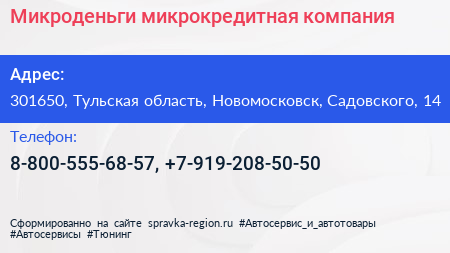 Микроденьги, микрокредитная компания по адресу 301650, Тульская область, Новомосковск, Садовского, 14 в дальнейшем Организация, размещена в следующих категориях: