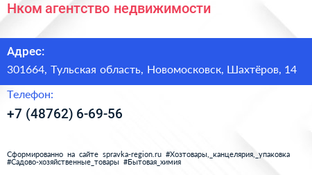 Нком, агентство недвижимости по адресу 301664, Тульская область, Новомосковск, Шахтёров, 14 в дальнейшем Организация, размещена в следующих категориях: