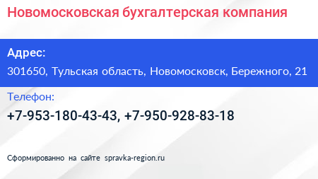 Новомосковская бухгалтерская компания по адресу 301650, Тульская область, Новомосковск, Бережного, 21 в дальнейшем Организация, размещена в следующих категориях: