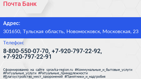 Почта Банк по адресу 301650, Тульская область, Новомосковск, Московская, 23 в дальнейшем Организация, размещена в следующих категориях: