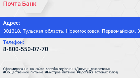 Почта Банк по адресу 301318, Тульская область, Новомосковск, Первомайская, 3 в дальнейшем Организация, размещена в следующих категориях:
