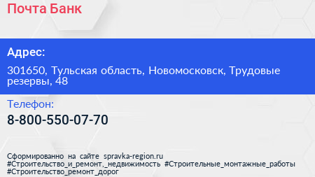Почта Банк по адресу 301650, Тульская область, Новомосковск, Трудовые резервы, 48 в дальнейшем Организация, размещена в следующих категориях:
