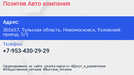 Позитив-Авто, компания по адресу 301657, Тульская область, Новомосковск, Узловский проезд, 5/1 в дальнейшем Организация, размещена в следующих категориях: