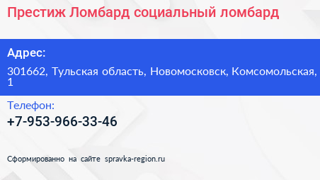 Престиж Ломбард, социальный ломбард по адресу 301662, Тульская область, Новомосковск, Комсомольская, 1 в дальнейшем Организация, размещена в следующих категориях:
