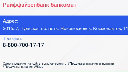 Райффайзенбанк, банкомат по адресу 301657, Тульская область, Новомосковск, Космонавтов, 11 в дальнейшем Организация, размещена в следующих категориях:
