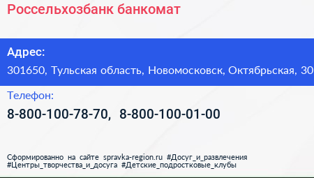 Россельхозбанк, банкомат по адресу 301650, Тульская область, Новомосковск, Октябрьская, 30 в дальнейшем Организация, размещена в следующих категориях:
