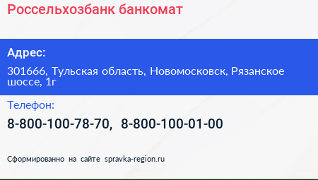 Россельхозбанк, банкомат по адресу 301666, Тульская область, Новомосковск, Рязанское шоссе, 1г в дальнейшем Организация, размещена в следующих категориях: