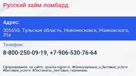Русский займ, ломбард по адресу 301650, Тульская область, Новомосковск, Маяковского, 25а в дальнейшем Организация, размещена в следующих категориях: