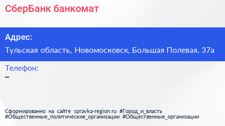 СберБанк, банкомат по адресу Тульская область, Новомосковск, Большая Полевая, 37а в дальнейшем Организация, размещена в следующих категориях: